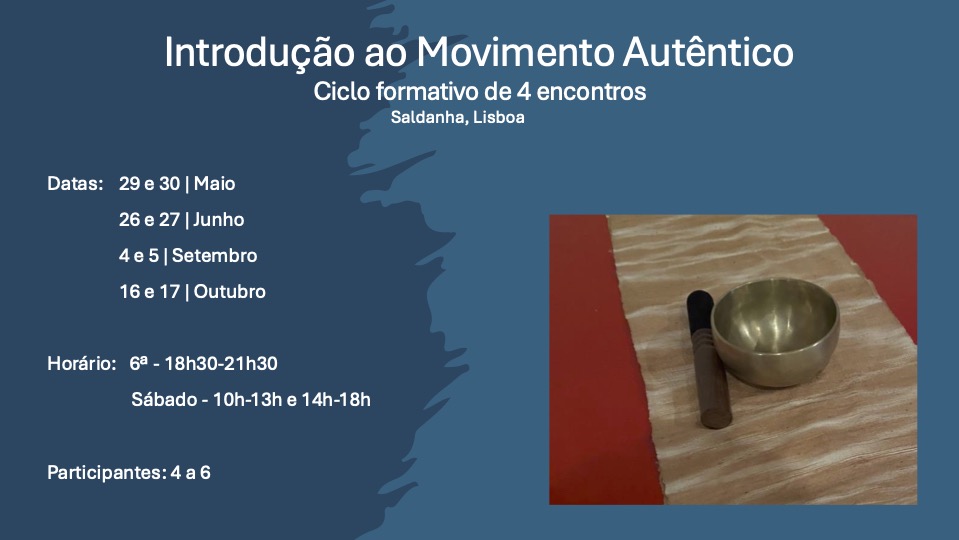 Numa primeira abordagem ao Movimento Autêntico, propomos 4 encontros de 10 horas, num contexto grupal de tamanho reduzido (4 a 6 participantes), criando a intimidade necessária à descoberta de quem somos a cada momento. Com esta segunda edição pretendemos também criar um grupo de prática que se reuna mensalmente, juntando os participantes das duas edições.